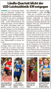 Besonders erfreulich: Auch eine österreichische Männerstaffel über 4×400 Meter wird an den Start gehen. Mit dabei gleich 2 Vorarlberger: Lukas Stegmüller (TS Bregenz Vorkloster) und Michael Gantner (ULC Dornbirn) bilden mit Julius Rudorfer und Raphael Briel das Quartett, das in Tampere um schnelle Runden kämpft.